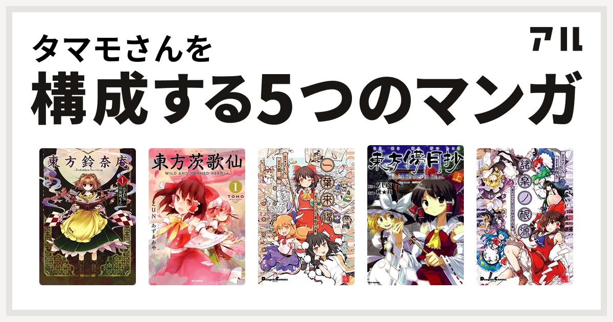タマモさんを構成するマンガは東方鈴奈庵 Forbidden Scrollery 東方茨歌仙 Wild And Horned Hermit 一葉来福 東方project 葉庭作品集 東方儚月抄 Silent Sinner In Blue 諸楽ノ根源 東方project 水炊き作品集 私を構成する5つのマンガ アル