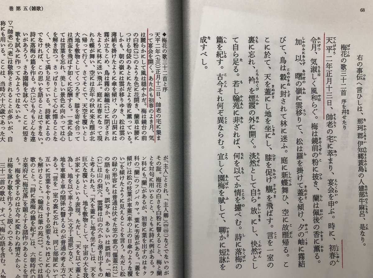 新元号 令和 の出典は 万葉集 の 梅花の歌32首 の序 後漢の書 文選 の句を踏まえていることが 新日本古典文学大系 萬葉集 一 の補注に指摘されています Togetter