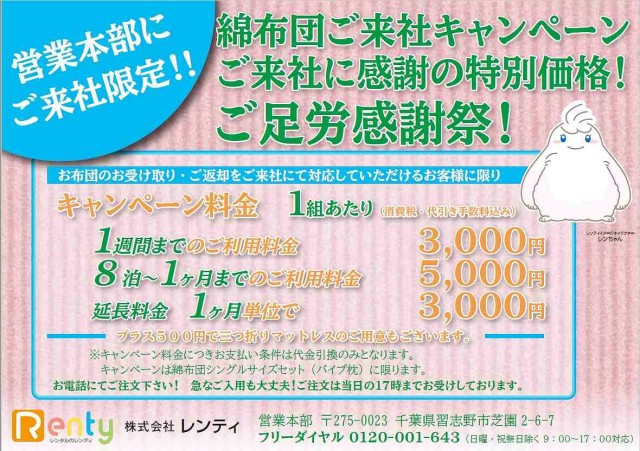 貸し布団 布団レンタル 寝具リース レンタルふとんの山下寝具 千葉サービスセンター